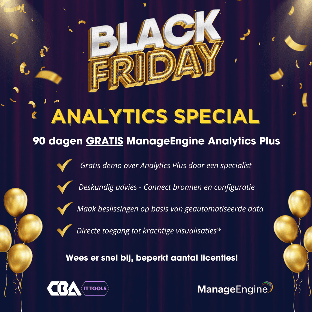 Get Ready to Kickstart the New Year with Powerful Insights and Visual Data Analysis. As a CBABenelux customer, you now have the opportunity to enjoy 90 days of free access to Analytics Plus from ManageEngine. Take advantage of this exclusive Black Friday offer and discover how data can empower you to make smarter business decisions.
