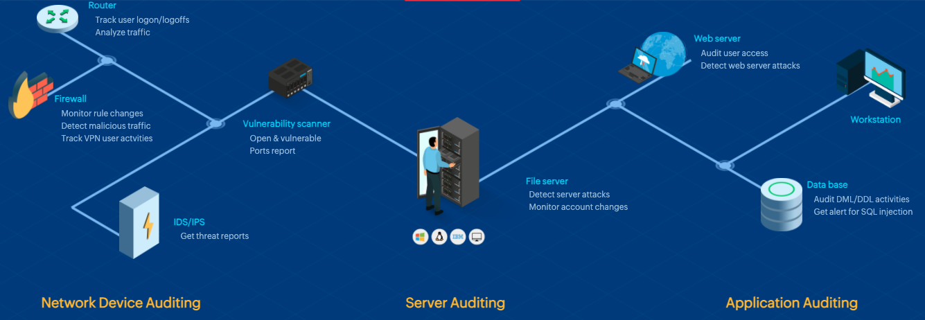 EventLog Analyzer ondersteunt vrijwel elke logbron: Windows, Linux, Unix, routers, switches, firewalls, IDS/IPS, applicaties zoals IIS, SQL, Oracle, DHCP en nog veel meer. Dankzij krachtige rapportage- en analysefuncties beschik je over de informatie die je nodig hebt om je netwerk te beveiligen én aan regelgeving te voldoen.
